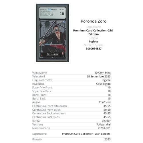 One Piece Roronoa Zoro OP01-001 Leader AiGrading Voto 10