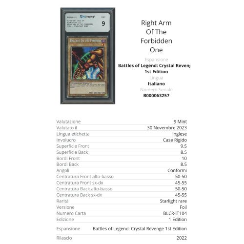 Yu-Gi-Oh! Battaglie della Leggenda:Vendetta Cristallo Braccio Dx del Proibito AiGrading Voto 9