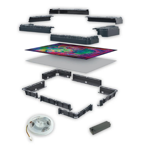 Il prodotto include: puzzle 520 pezzi (49 x 36 cm), cartone rigido, bustina di colla, cornice da assemblare, modulo elettronico, striscia LED RGB, poster di riferimento e manuale di istruzioni.