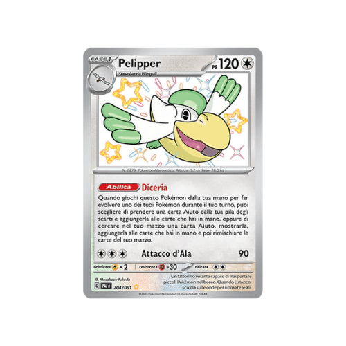 Carta singola da collezione del Gioco di Carte Collezionabili Pokémon. Pelipper è una carta Shiny Rare appartenente al set Destino di Paldea, stampata in lingua italiana. Ideale per collezionisti e appassionati